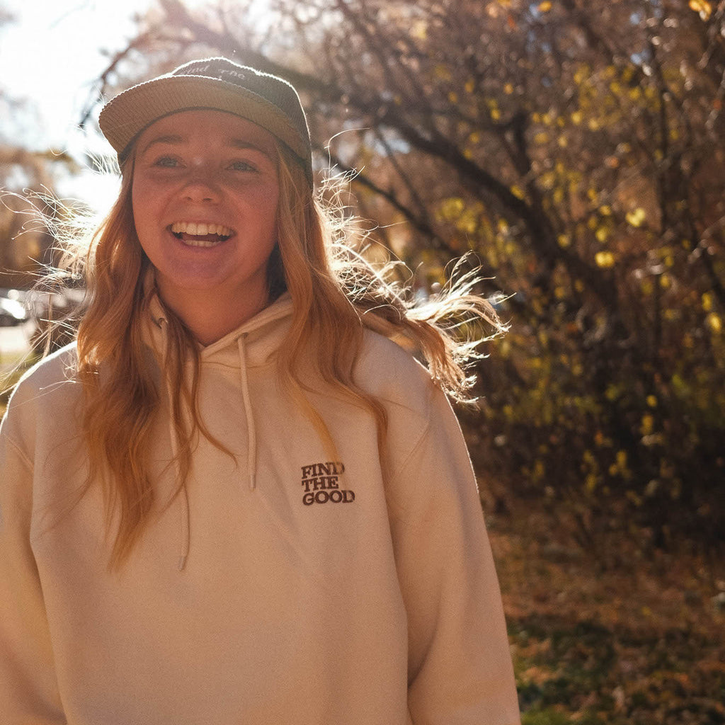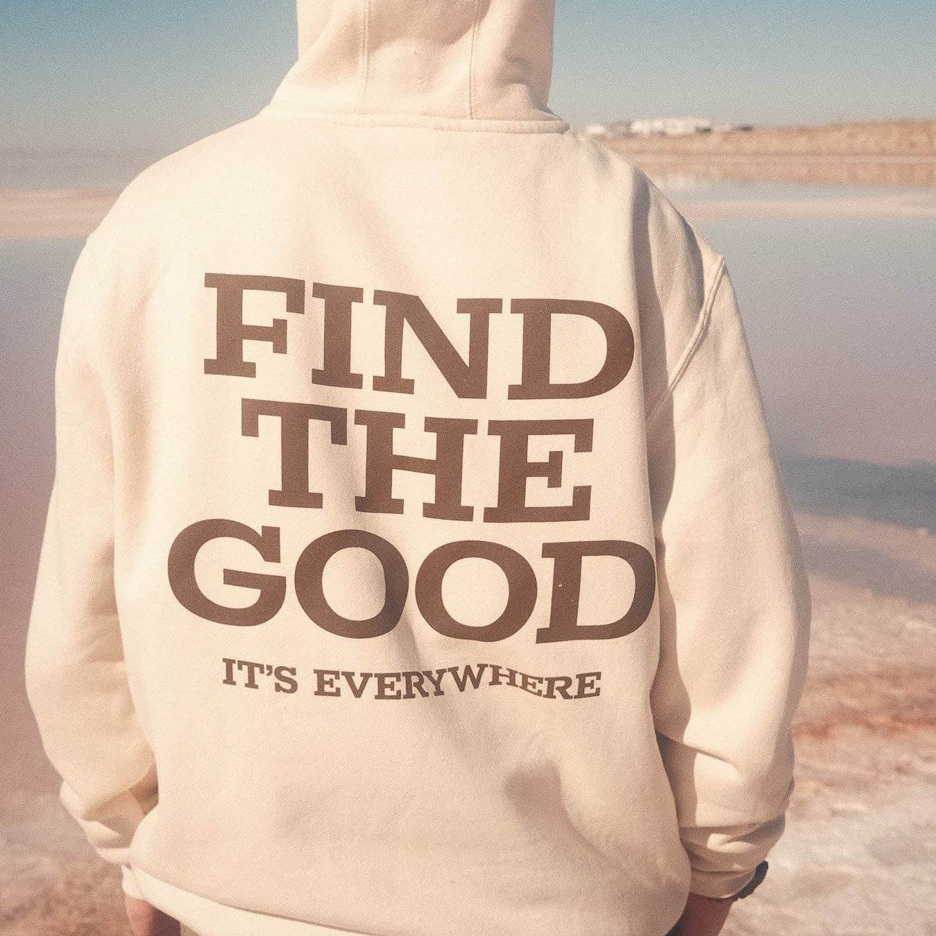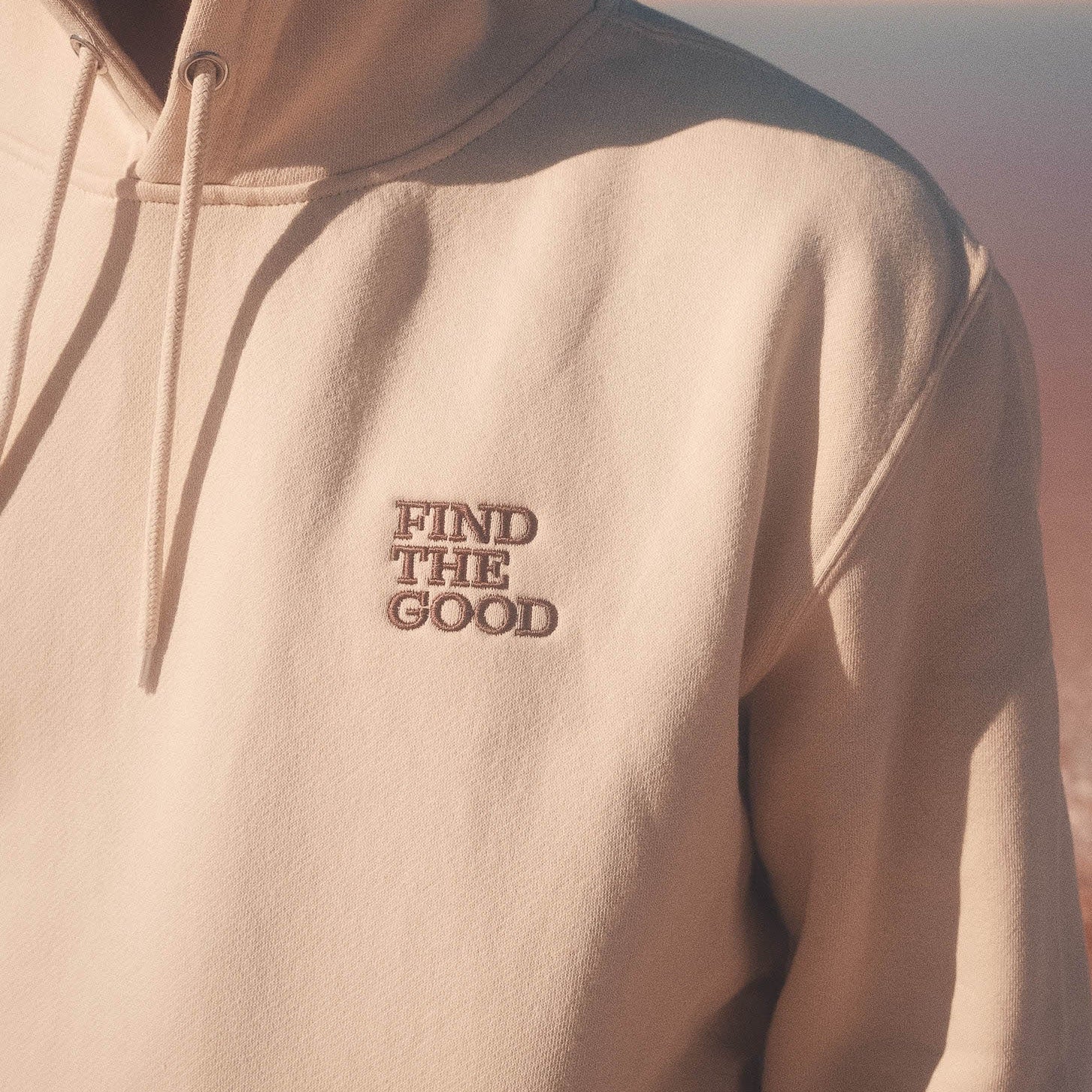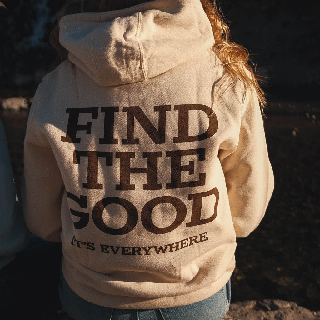 Featuring embroidered “Find The Good” lettering on the left chest and a bold“Find The Good. It’s Everywhere.” screenprint across the back, this hoodie is a wearable reminder to lead with optimism.