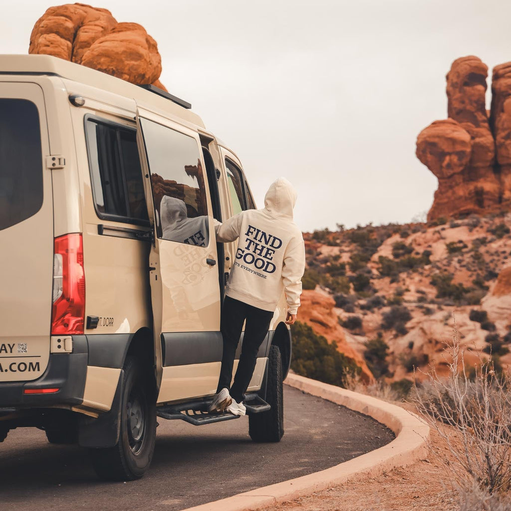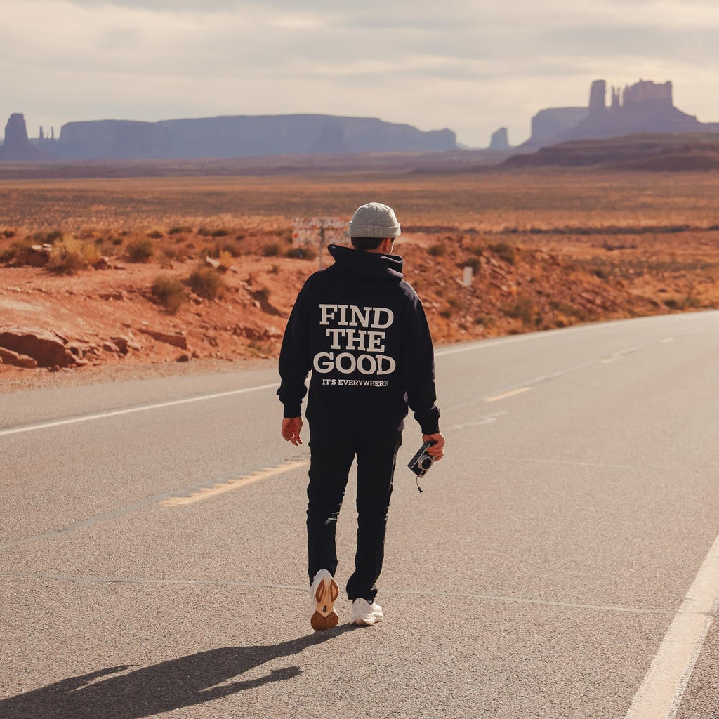 Featuring embroidered “Find The Good” lettering on the left chest and a bold“Find The Good. It’s Everywhere.” screenprint across the back, this hoodie is a wearable reminder to lead with optimism.