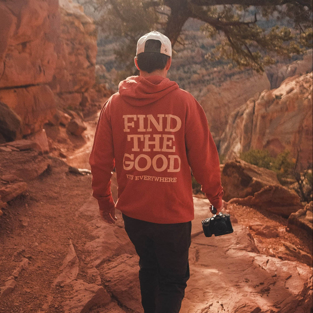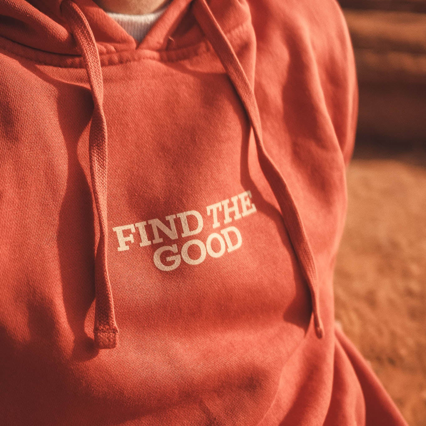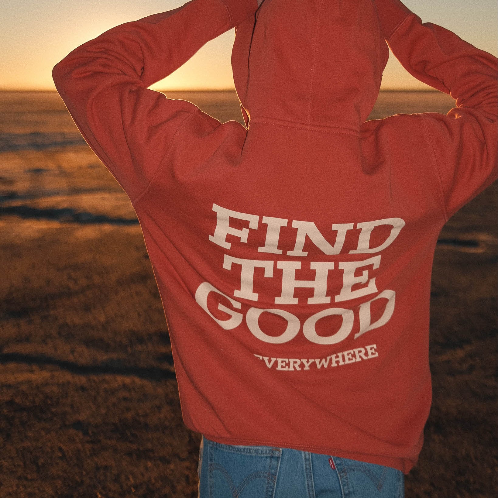 Featuring “Find The Good” lettering on the center chest and a bold “Find The Good. It’s Everywhere.” screenprint across the back, this hoodie blends comfort and message driven design into one elevated essential. It feels like your favorite vintage wash hoodie!
